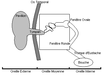 Une oreille se compose de trois parties comme on peut le voir sur le schéma ci-dessous, l'oreille externe, l'oreille moyenne et l'oreille interne.