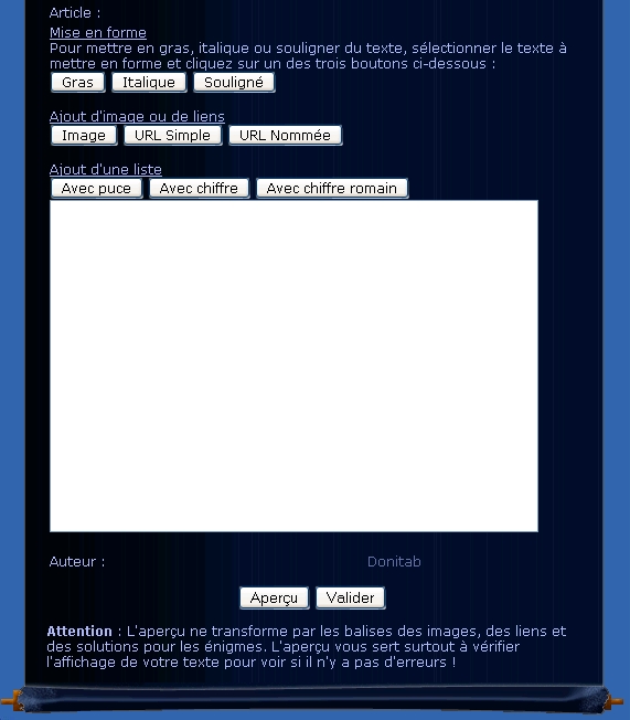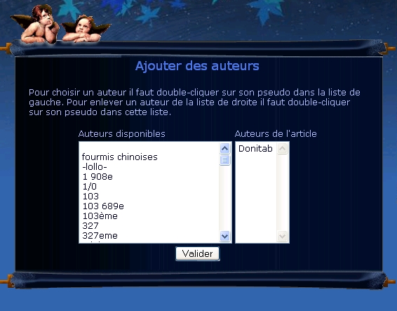 Une fois tous les champs renseignés, il ne vous reste plus qu'à appuyer sur le bouton "Valider" ou "Aperçu" pour avoir un aperçu de votre article, une fois publié. Si votre article n'est pas co-signé, votre article sera alors enregistré dans la base de données du site, où il sera par la suite visible une fois validé par un des administrateurs. Si vous avez choisi l'option "article avec plusieurs auteurs", vous serez dirigé vers une page où vous pourrez choisir les co-auteurs. Un double-clic sur le pseudo suffit. Il ne vous reste là encore qu'à valider. Encore une fois, si l'ajout d'un article vous pose le moindre problème, nous vous prions de contacter un membre de l'équipe pour vous aider.